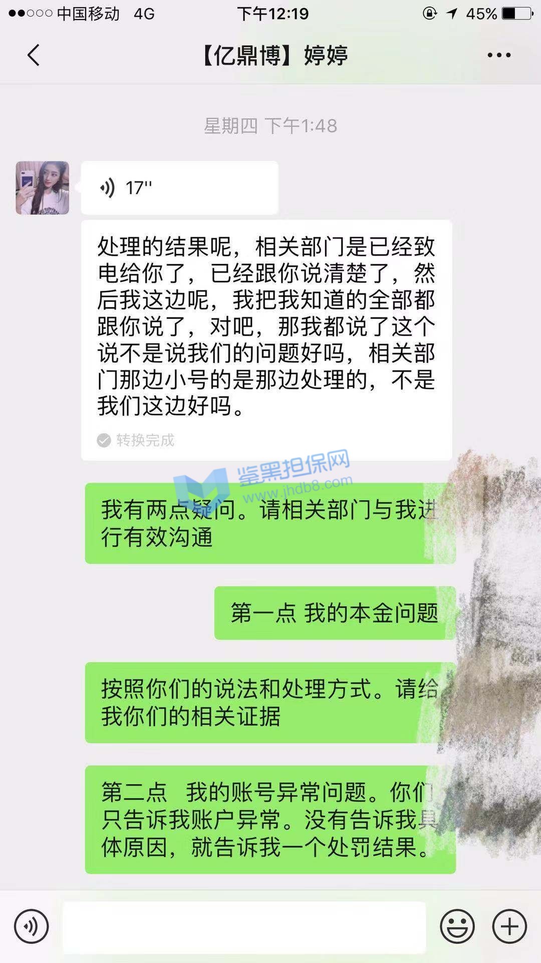 之前逛论坛的时候看到了亿鼎博,然后看优惠政策不错注册了在亿鼎博玩。玩了也快一年了,就在9月10月当天提款155438的时候被取消提款,并直接封禁账户。联系在线客服说稍后电话专员联系,电话专员电话打过来就只通知我账户系统检测出异常导致被封禁, 只退还最后一笔存款本金,让我尽快提款。账号后台直接给我扣款11万。后面我表示了对我账户异常原因表示了询问,电话专员表示他只负责告知这个结果,如果有疑问请与客服联系。后面我与娱乐城在线客服联系,也与微信客服进行联系,都只告诉我以专员致电内容,不告诉我账户异常原因,也不愿意进行和我沟通,就是互相踢皮球。后面我尝试去提款我账户本金8W5,可是依旧显示不能出款,仍需要打3w5流水。本人后面心态爆炸,后面8万5打百家乐3把全打没了。本人对亿鼎博娱乐城有两点最大异议:第一点:账号异常问题,只通知我账号异常,为什么异常,异常原因都不告诉我,只告诉我一个处罚结果,并一直不愿意与本人进行有效沟通,在线客服,微信客服,电话专员互相踢皮球。第二点:本金退还问题,只退还部分本金,本人是存了2笔存款共8万进行游戏后才提款一笔15万5,提过程中又存款一笔3万5,最后只退还提款前的最后一笔存款及提款过程中的那笔存款共8万5。讯问客服,客服说我第一笔存款后是进行游戏输掉的,可是我一直都是盈利的,中间输也就输了几千。 我现在游戏账户被封禁,更多游戏图片拿不出来。对于亿鼎博这种无理由黑钱的平台,大家千万不要去玩,服务态度差,黑钱还理直气壮。