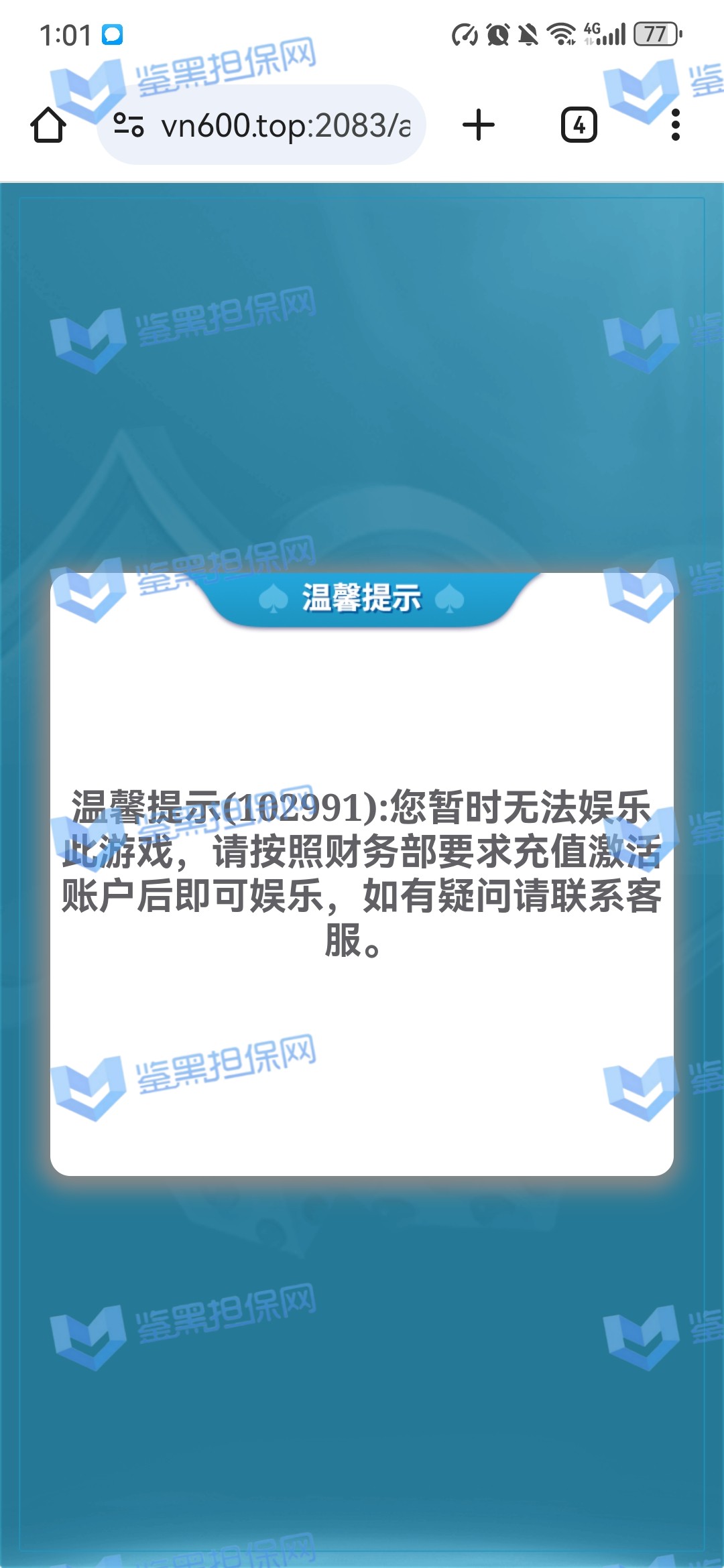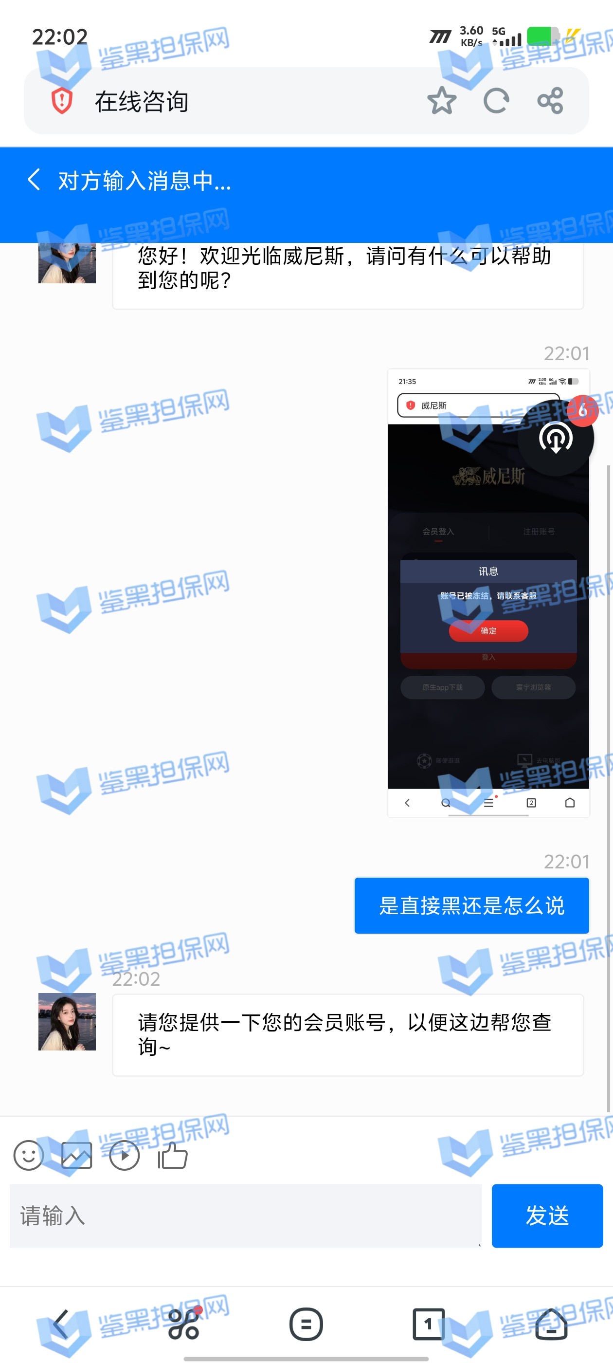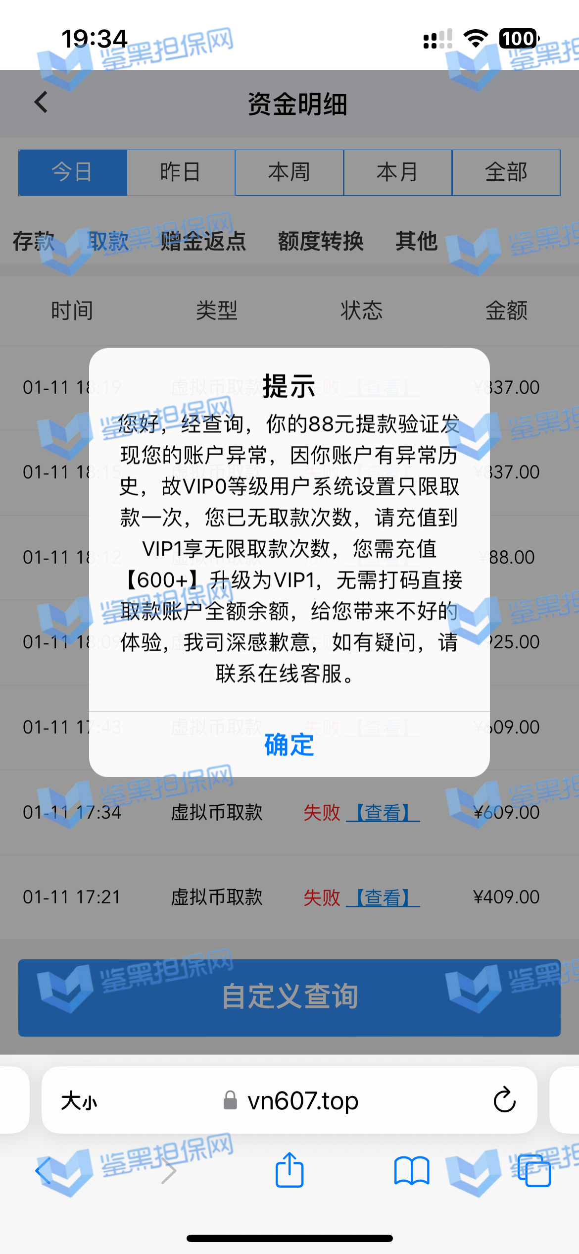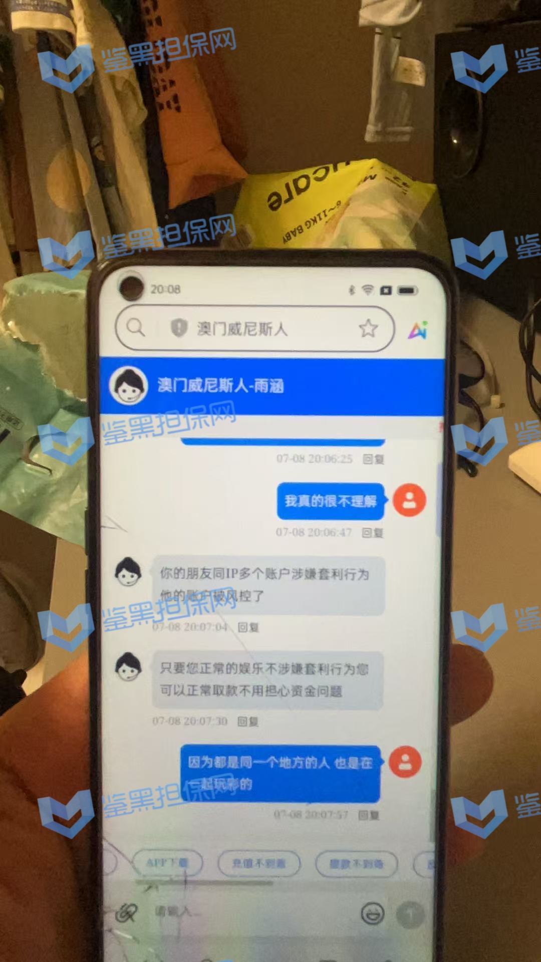 2025年1月23日下午我接到他们客服的电话邀请注册,说最高可以领288的彩金,我觉得这个平台不错挺大气的,就充了500元试试水。 因为他们平台我看是要求一倍流水提现,所以我就打到1300元申请了第一次提现,结果失败了,他们客服说让我打注册彩金288的5倍1440元才能提款,我就去他们指定的PG电子去打流水,当天晚上打够流水以后找他们提款再次失败,又改口说要打够提现余额的1300*5倍=6500元的流水才能提现。从第二次给我退回来以后他们给我后台修改了PG电子的赔率,损失从15%提高到50%,我一算账根本不够,然后我就又去打了百家乐,想着输完就不提,赢了就去刷流水,也是运气好,从1300元梭哈到5000多元,回来刷了一晚上的PG电子,一直到1月24日的中午,才刷够流水。1月23日刷了2000多流水亏了300多,差不多15%的亏损,第二天刷了4000多亏损超过2300元,我也没说什么,想着打够就提现吧。然后1月24日我去申请提现,客服先给我提了个88元,然后再提的时候以不足vip1为由让我继续充值700元到vip1,我又充了700,然后又去申请提现,提现后又给我拒绝了,说要我再充值1000元才能使用钱包收款,这回已经引起我的警觉了,我就和他们客服再三确认,这回充1000一定没问题了吧!他们客服拍着胸脯说百分之百一定能提现,给我保证,我就又充了一千。冲进去以后我申请提现又失败了,理由是资金风控让我再充值余额一半的钱也就是4000多元解除风控(我的资金是工资卡没有任何问题),他们客服就变成了复读机,一直让我继续充值,我说什么都没用,我说刚才不是百分之百能提现成功吗?他们也不理我,说这次百分之百能提成功。所以他们平台是输了钱算我倒霉,赢了钱就开始连环套路骗钱的骗子平台 以下是我经过技术手段查到的该平台的所有域名(我本人是计算机科班出身) 威尼斯人: wn88.vip vn600.top vn601.top vn602.top vn603.top vn604.top vn605.top vn606.top vn607.top vn608.top vn609.top vn610.top wn880.top wn881.top wn882.top wn883.top wn884.top wn885.top wn886.top wn887.top wn888.top wn889.top wn890.top wn891.top wn892.top wn893.top wn894.top wn895.top wn896.top wn897.top wn898.top wn899.top vn4456.com vn4457.com 81157.cc 元大娱乐城(同一个主体运营的另一家平台): yd7575.com yd9568.com yd3637.com yd3690.com yd5748.com yd9928.com yd3657.com yd2234.com yd1238.com yd1239.com yd1237.com yd2235.com yd1230.com yd1236.com yd1235.com