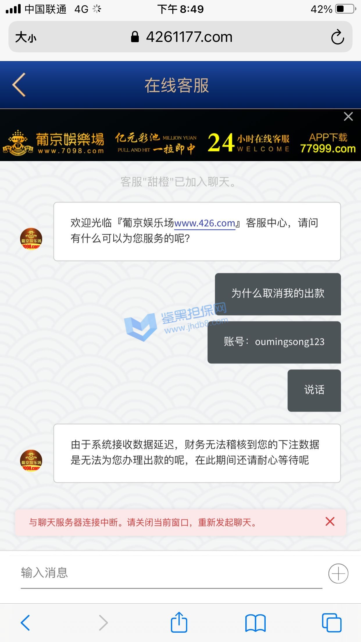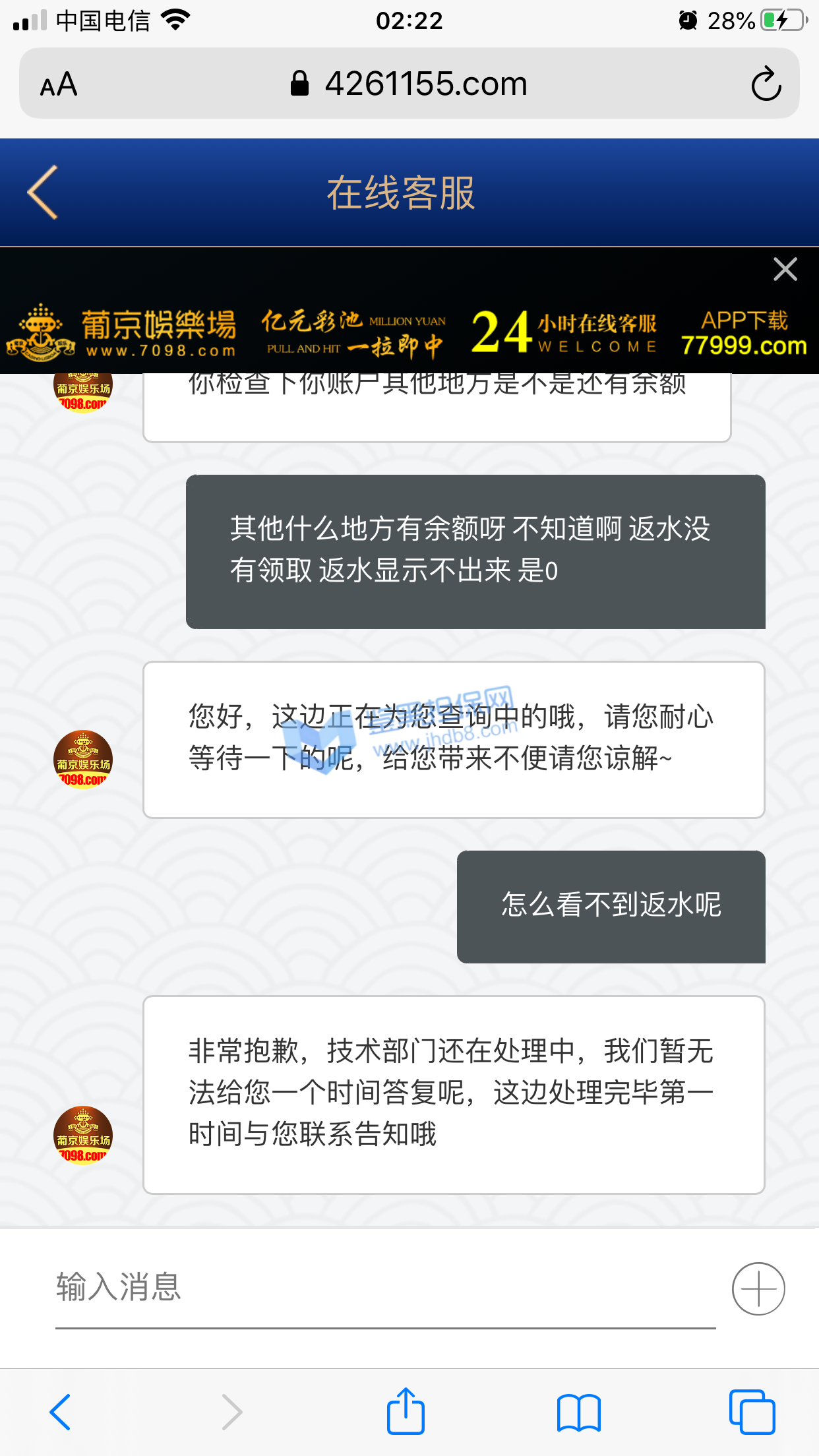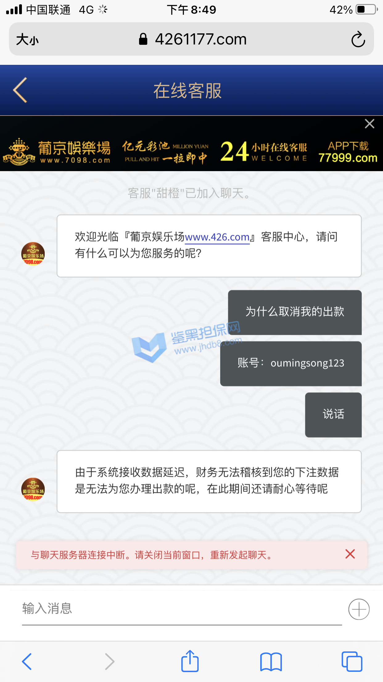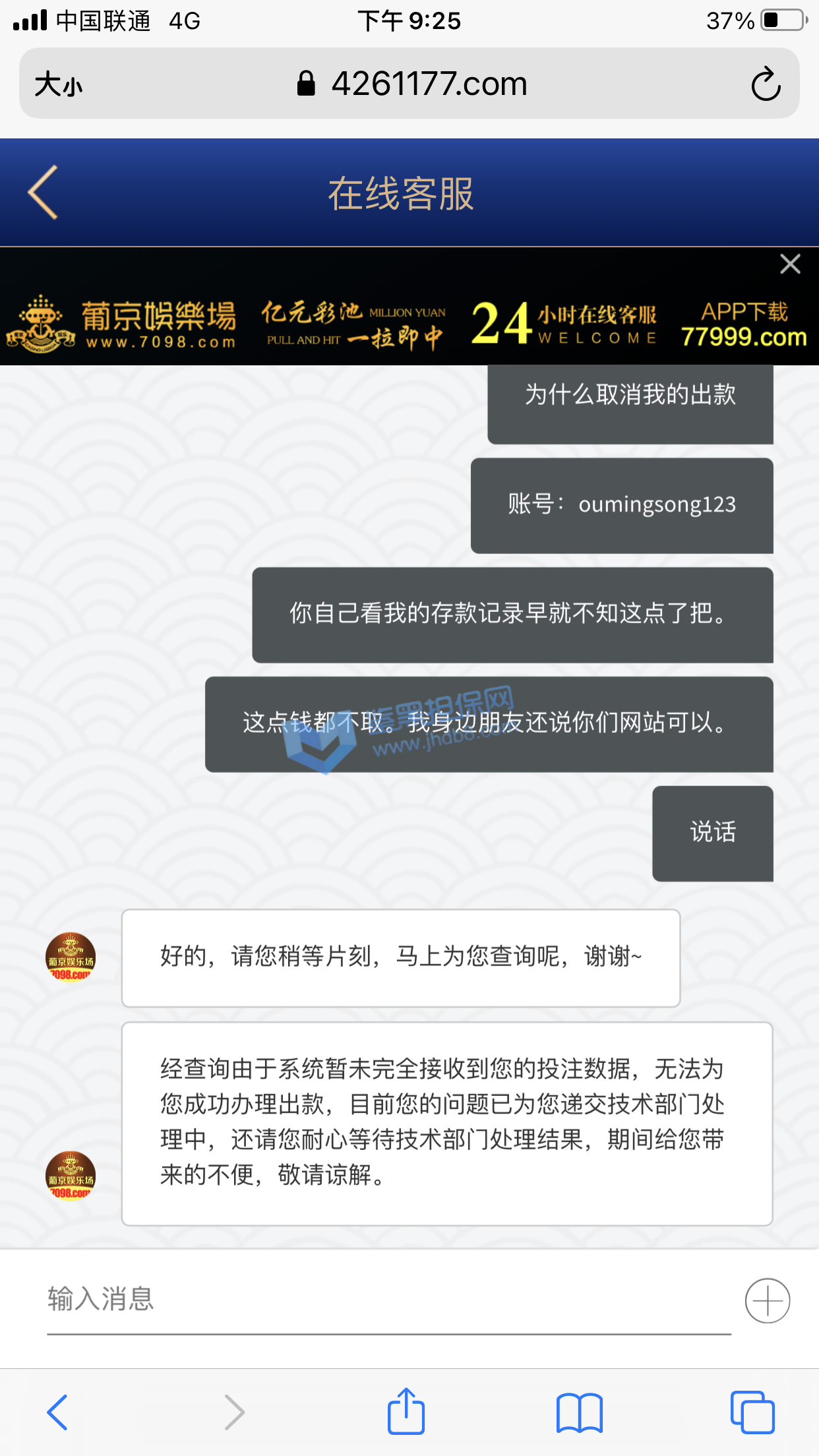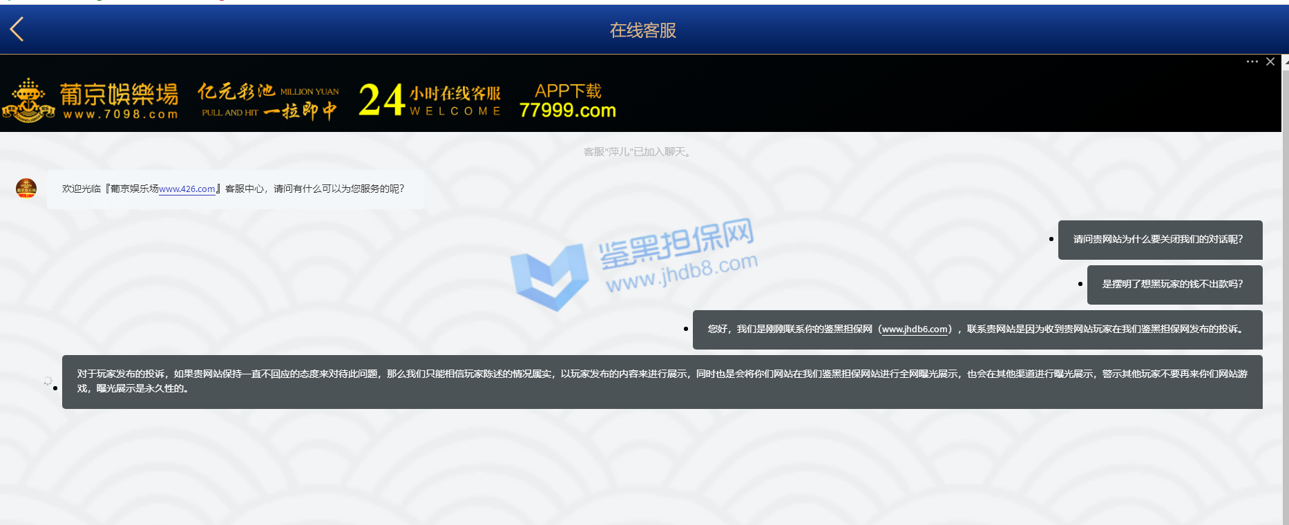 本人账号 ey888888 在6月27日注册的账号,马上就收到了电话回访,说让我参加首存50%,我充值了100领了50输掉了,次日6月28又收到客服电话邀请我再来参加50%,这次充了300 送了150,提现501,先是接到核实银行卡和个人信息,最后说核实完毕,由于我是第一次提现需要把虚拟币的地址发给POP软件的专员,POP这个软件是属于拉黑删除直接自动清空聊天记录的,本人有幸录过充值的视频,请看图1-图3 是和专员客服的聊天记录和充值记录,本人能提供3仅3天的3次的电话通话录音证明是他们电话特邀邀请充值的,本人的确在鉴黑担保网查过他们的官网没有记录当我打开pop聊天软件找专员的时候发个消息在吗聊天记录直接清空了还显示对方不是你的好友,当我重新登录平台的时候显示密码错误,直接修改客户会员的登录密码,找客服就说什么电子套利不做任何解释,本人仅3天都是只用流量进行游戏,玩了MG电子 和PG电子,本人只有一个账号 名下只有一张银行卡,没充值之前一口一个哥哥发那个语音夹子的说,还劳逸结合,有空再来,赢钱了提现直接相当于封号了,次平台多个POP专员 XX001 - XX0012 目前我知道有12个专员XX+后面的数字 001-012排序过去的,估计追回渺茫了,除非鉴黑团队能联系到比客服还高级别的管理。