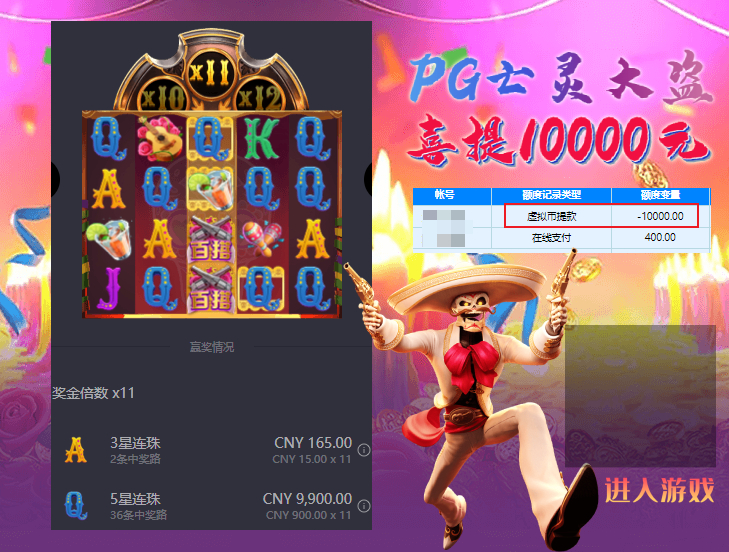 存款400元后转入PG老虎机钱包,选择【亡灵大盗】游戏,中奖5星连珠,爆奖9900元,中奖3星连珠,中奖165元,恭喜该玩家盈利提款1万元!!!!